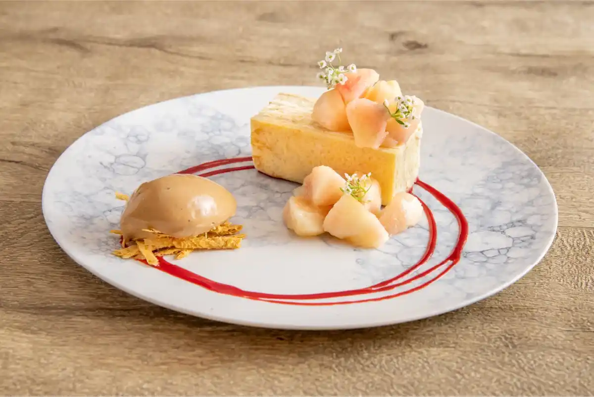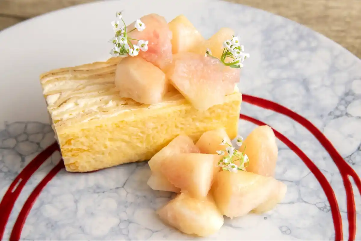 瑞々しい白桃に風味豊かなミルキッシュチーズクリームを何層にも重ね、ミルクレープ仕立てに。香り豊かな紅茶アイスを添えて。※数量限定 |