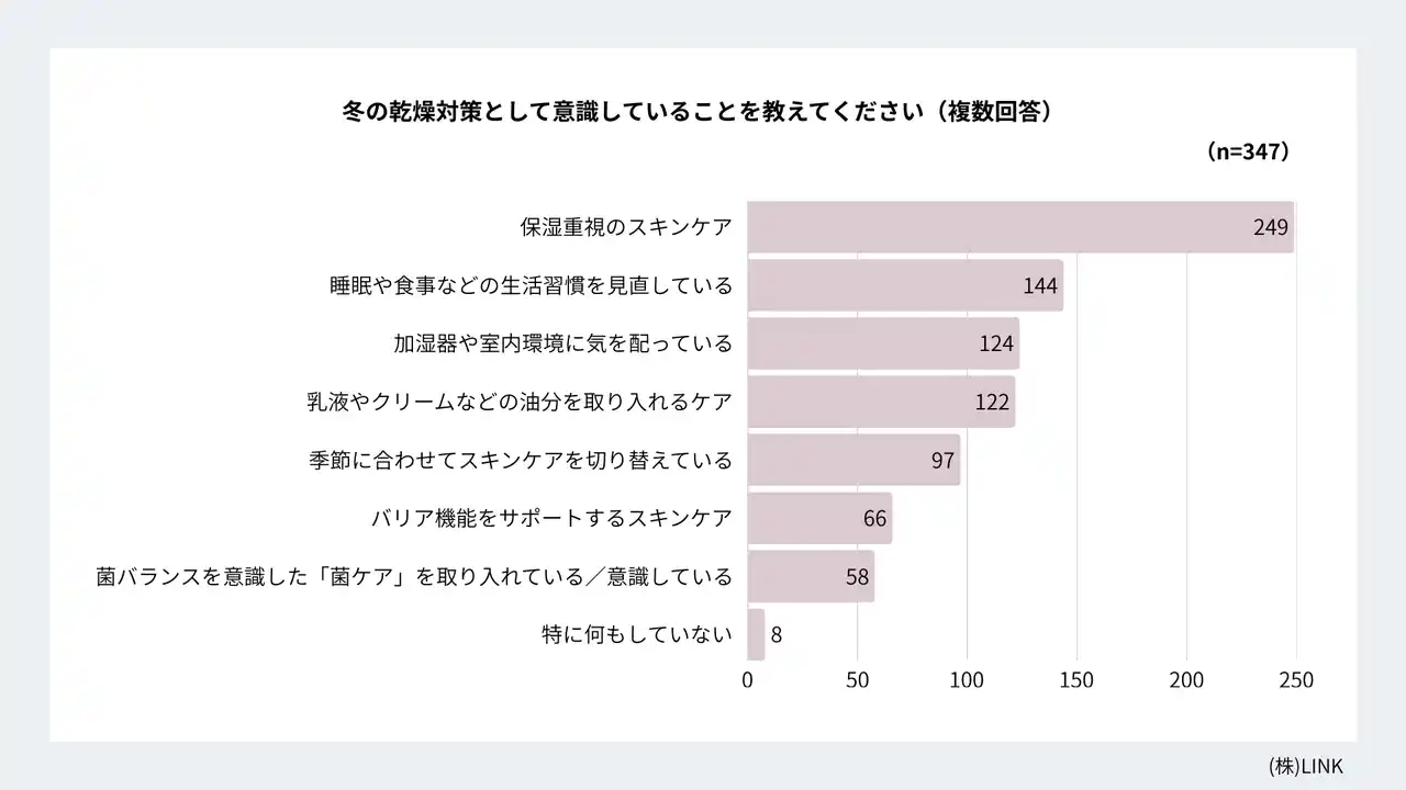 | 【設問】冬の乾燥対策として意識していることはありますか?(複数回答/n=347) | ||||||