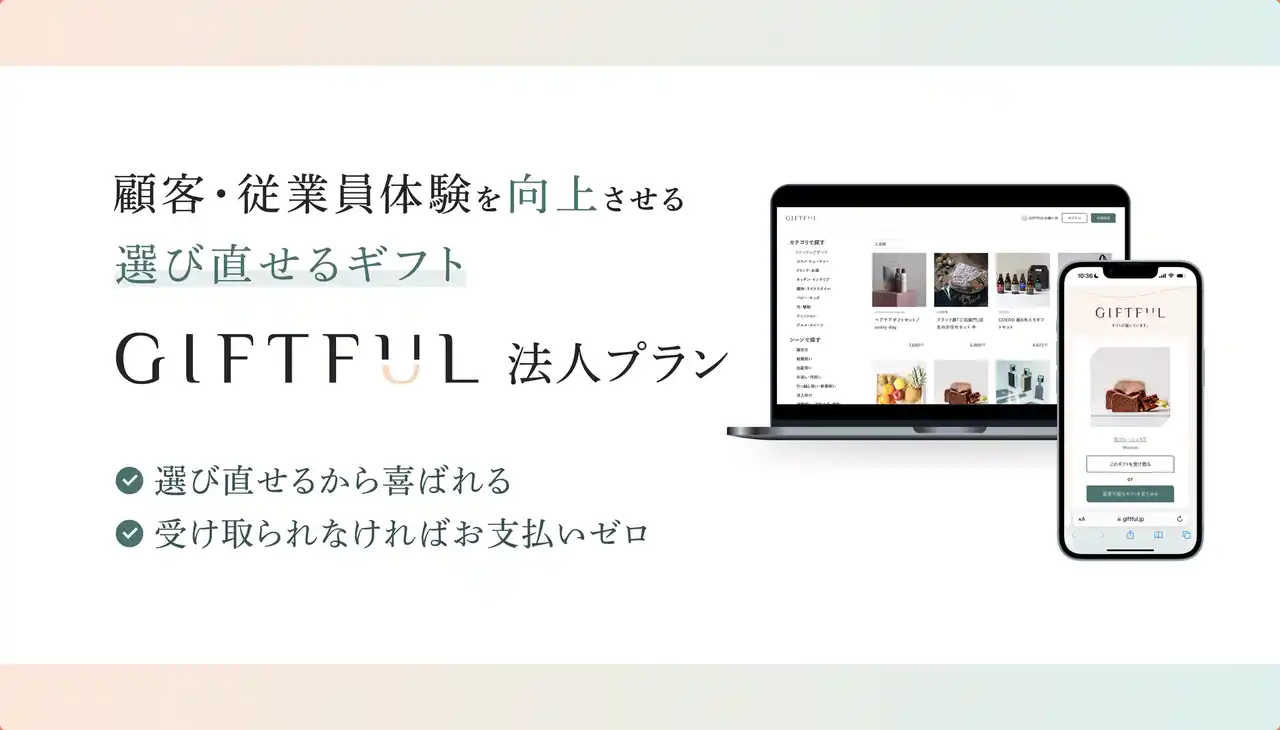 GIFTFUL 法人プランは、特許取得の「選び直せるギフト」を法人向けに最適化し、受け取られないギフトは支払いゼロという新しい料金設計を採用した法人向けギフトサービスです。オンライン送付から手渡し、住所直送まで対応し、受取状況も可視化できます。 |
