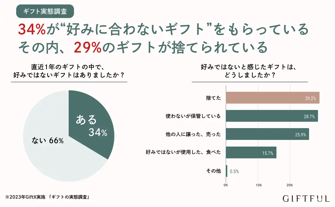 GIFTFULが実施した調査では、過去1年間において「好みではないギフトをもらったことがある」と回答した方は34%にのぼり、受け取ったギフト全体のうち、好みではなかったギフト個数の割合は22%という結果となりました。さらに、好みではないギフトのうち29.2%が実際に「捨てられている」ことも判明しています。 |
