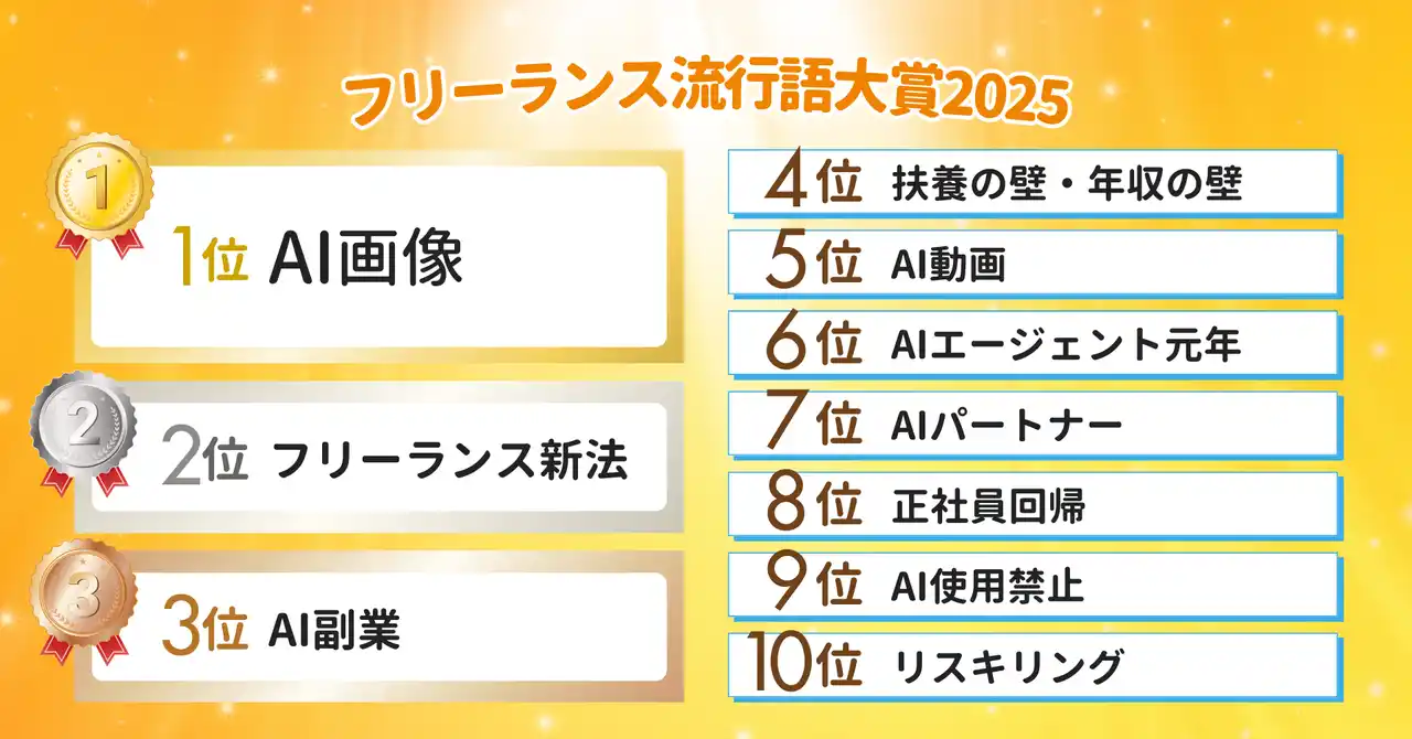3位にランクインした「AI副業」は、AIが新しい収入源を生み出す手段として認識され、フリーランスへの参入障壁を下げている実態を表しています。「生成AIの普及で、誰でも副収入や新しい働き方に挑戦できる時代だと実感した」というコメントにあるように、技術的なハードルが下がったことで、副業・複業への意欲が高い層からの注目が集まりました。 |