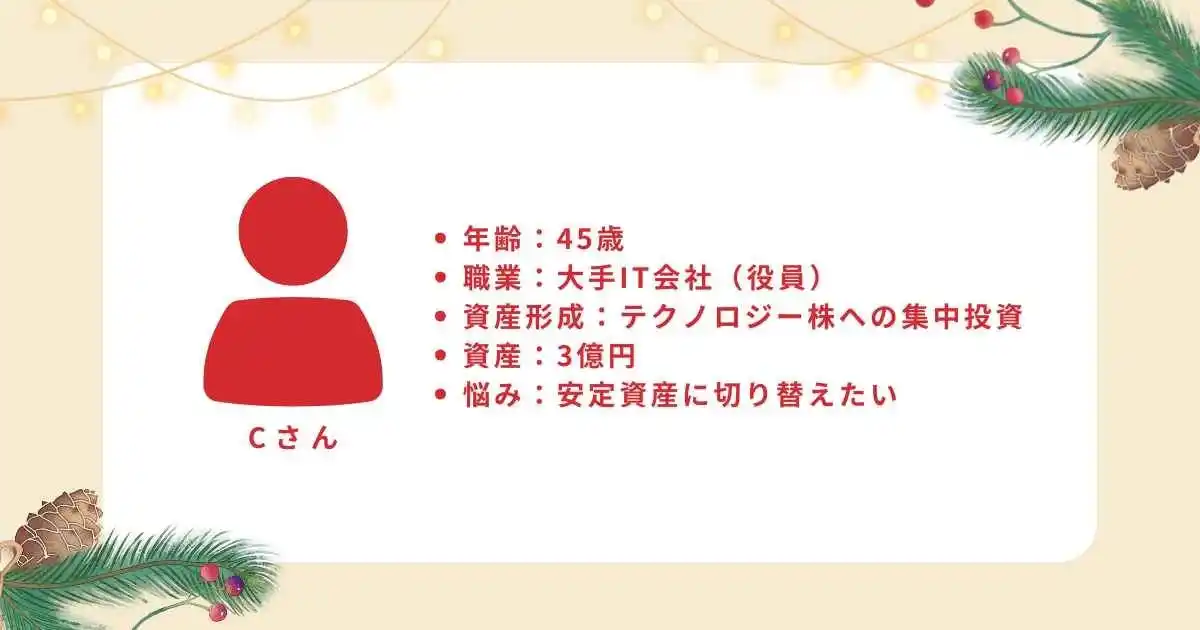 元々、テクノロジー業界への深い知見があり、米ハイテク株に集中投資していました。それが急成長して金融資産は3億円まで増えましたが、テクノロジー業界は波が激しいため、技術革新により価値が失われるのではないかと不安でした。 |
