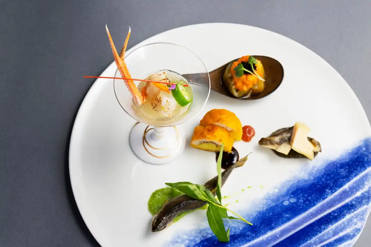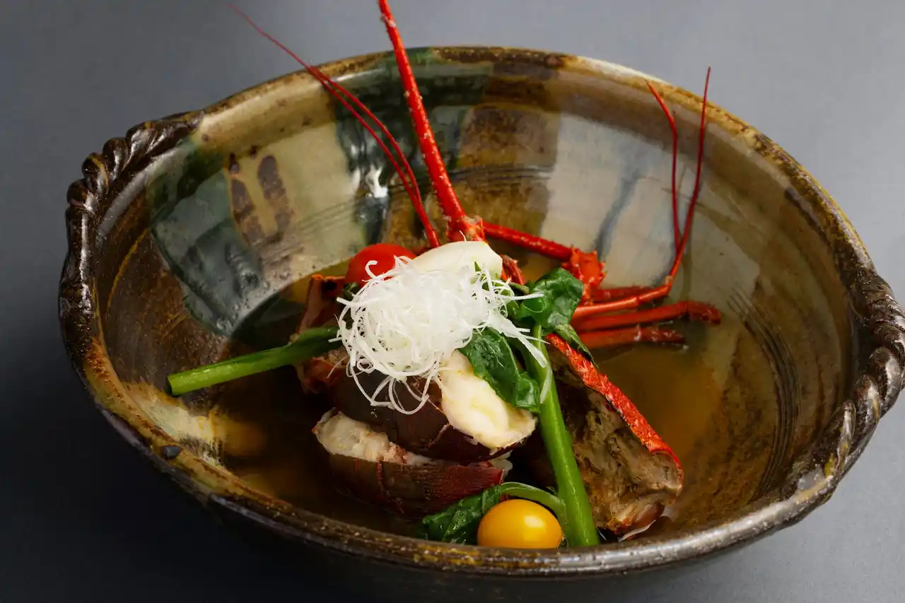 一人一尾を贅沢に使用した伊勢海老、戸田産の鮑や原木椎茸、駿河湾でしか獲れない希少な高足ガニなど、この土地ならではの食材を、和食をベースにした独創的な調理法で仕上げます。素材の旨味や滋味、四季折々の味覚を存分に活かした料理の数々を、富士山を眺める絶景の個室にてお愉しみいただけます。 |
