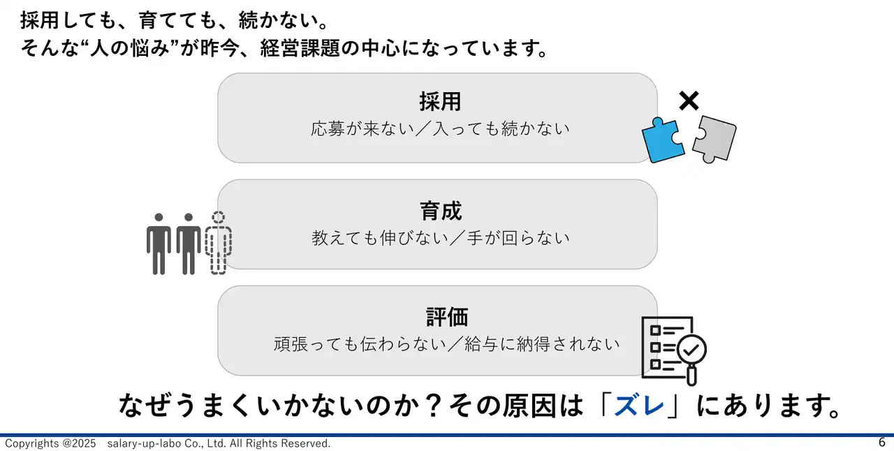 しかし、実際には 「採用・育成・評価」がつながっておらず、基準がズレていることが、定着しない最大の原因であることが強調されました。 |