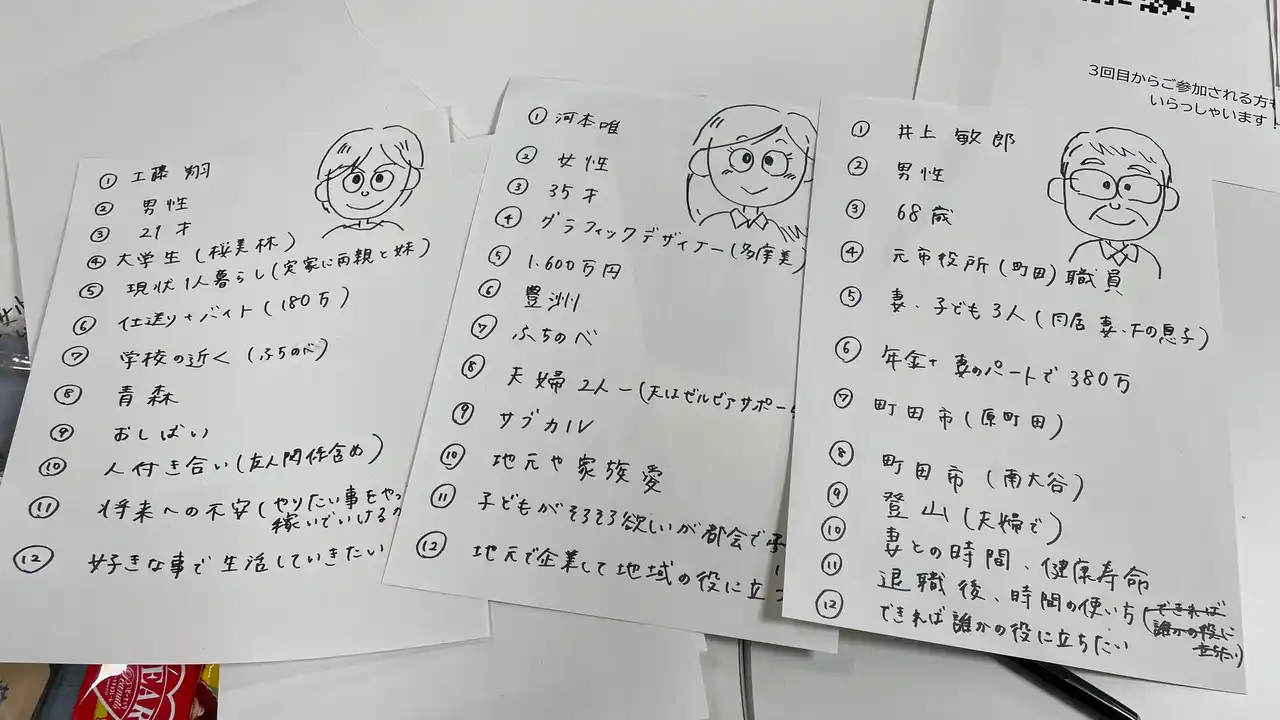 第2回で話し合われた「まちだで夢がかなえられそうな人」がまちだで送るストーリーについてグループディスカッション(雑談・交流を交えながら進行) |