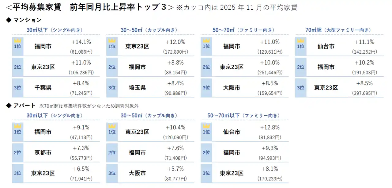 <2025年11月 全国主要都市における賃貸マンション・アパートの平均家賃(面積帯別)> |
