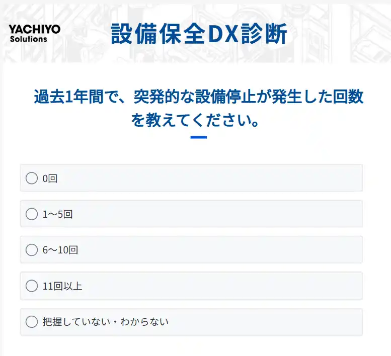 | こうした現場の実態を踏まえ、八千代ソリューションズは、既存のサービスで培った知見をもとに、保全診断の第一弾となる「設備保全DX診断」の提供を開始します。 | |||||