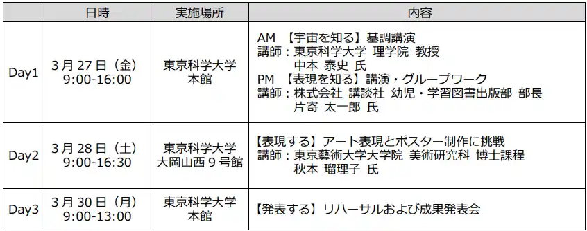 | 基調講演には、東京科学大学 理学院 教授の中本 泰史氏が登壇。参加者は、中本氏から惑星・宇宙に関する最先端の知識を学ぶほか、株式会社 講談社 幼児・学習図書出版部 部長 片寄 太一郎氏から表現方法について学び、さらに東京藝術大学大学院の秋本 瑠理子氏の指導のもとアート表現に挑戦します。また、最終日の成果発表会では、探究を通じて得られた知識や気づきを活かし、「好奇心でめぐる宇宙マップ」としてポスターを制作し、発信します。 | |||||||||||