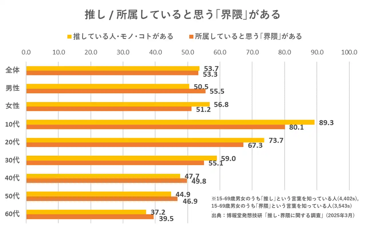 発想技研で2025年3月に実施した調査によると、10-60代で推している人・モノ・コトがある人の割合は53.7%、自身が所属していると思う界隈があるという人の割合は53.3%と過半数を上回っており、50-60代でも拡大の兆しを見せています。