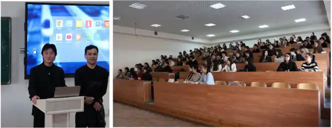■カラカルパク大学の学生への説明会の様子_左写真)弊社社長と通訳、右写真)大勢のカラカルパク大学の学生 |