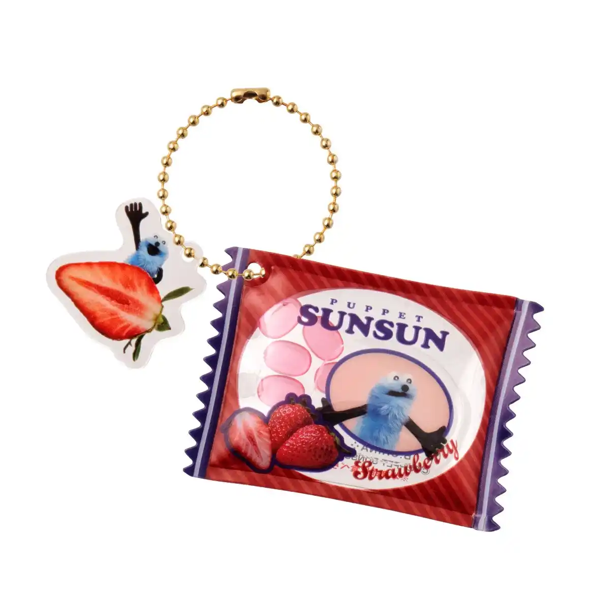 振るとシャカシャカ音がするキャンディパッケージ風のチャームが登場。スンスンたちがフルーツからひょっこり顔をだしているチャームも付いたダブルスイングです。 |