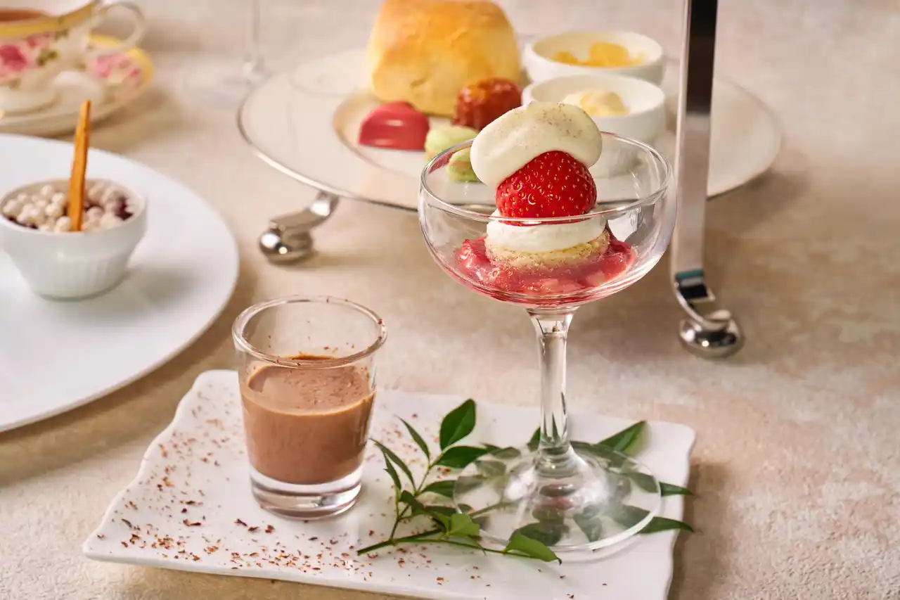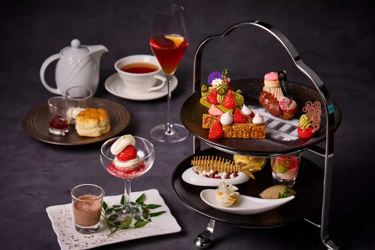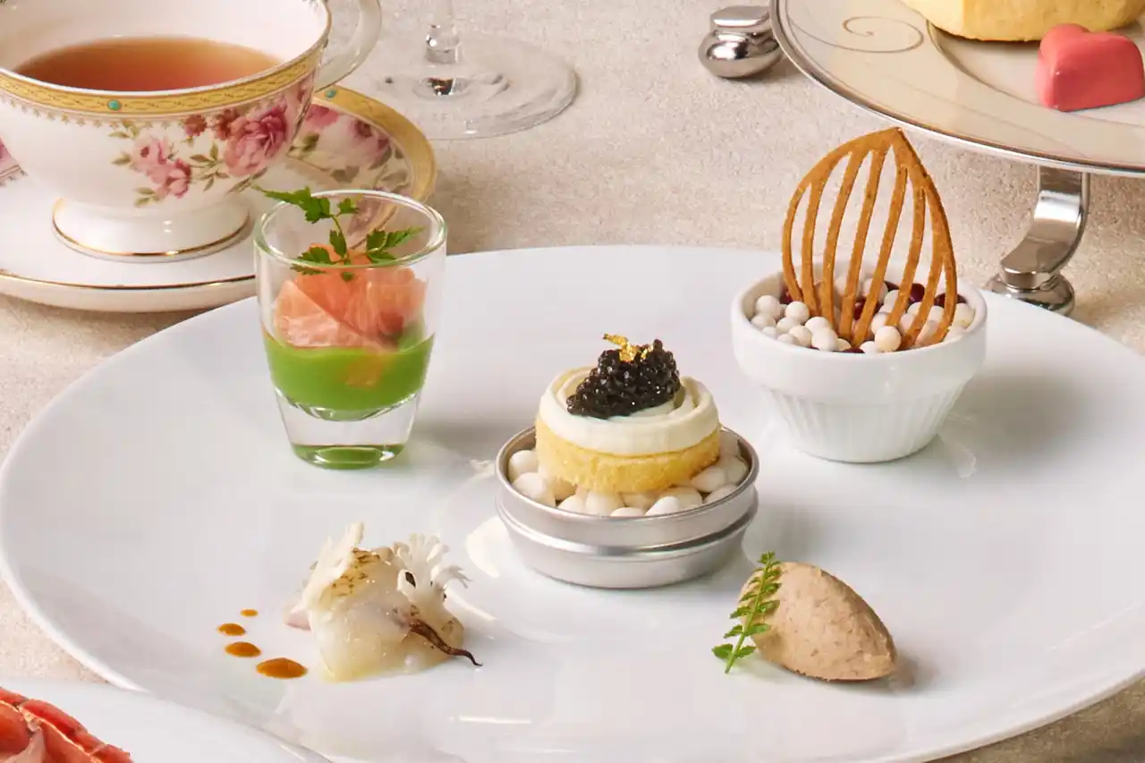 ~フレーズ~」は、旬のいちごとコク深いショコラに3種類のお茶の香りを加えて繊細に仕上げたプチスイーツと、キャビアやオマール海老など豪華食材を用いたフレンチセイボリーをご用意します。乾杯を彩るスパークリングワインで始まり、さらに3時間のフリーフロードリンクで、ゆったりと贅沢な午後のひとときをお過ごしいただけます。3日かけて仕上げる抹茶ショコラのフレジェ、ほうじ茶の香ばしさを閉じ込めたエクレア、アールグレイ香るミルフィーユといった個性豊かなプチスイーツで、洗練された和と洋の融合をお楽しみください。