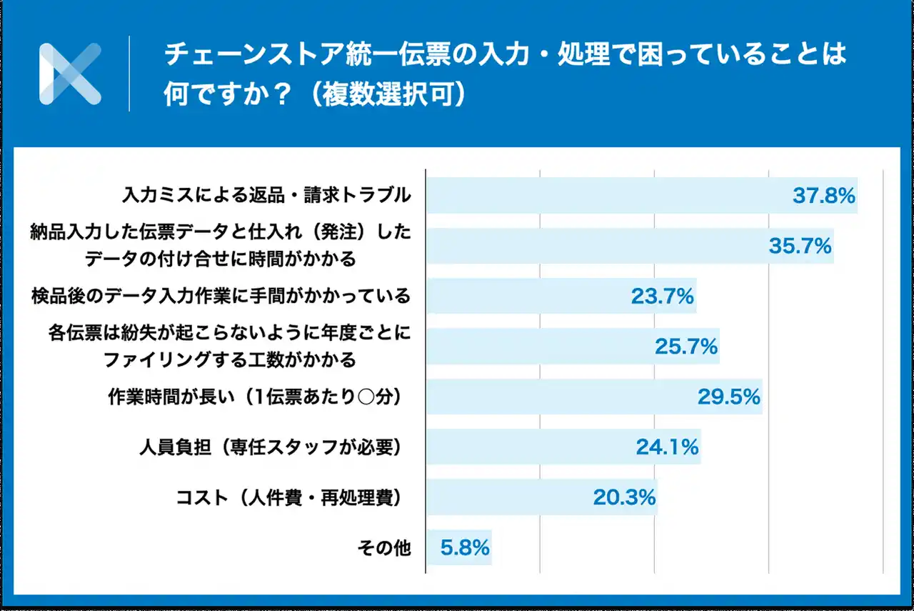 「チェーンストア統一伝票の入力・処理で困っていることは何ですか?」と質問したところ、最も多かったのは「入力ミスによる返品・請求トラブル」で37.8%でした。次いで「データの付け合わせに時間がかかる」が35.7%となっており、作業効率や処理精度がボトルネックになっていることが分かります。運用面では「作業時間が長い」が29.5%、「ファイリングする工数がかかる」が25.7%といった点も課題として挙げられており、日常業務における負担の大きさがうかがえます。総合的に見ると、入力の標準化や電子化、自動照合の仕組み、ワークフローの刷新による省力化へのニーズが高いと言えるでしょう。 |