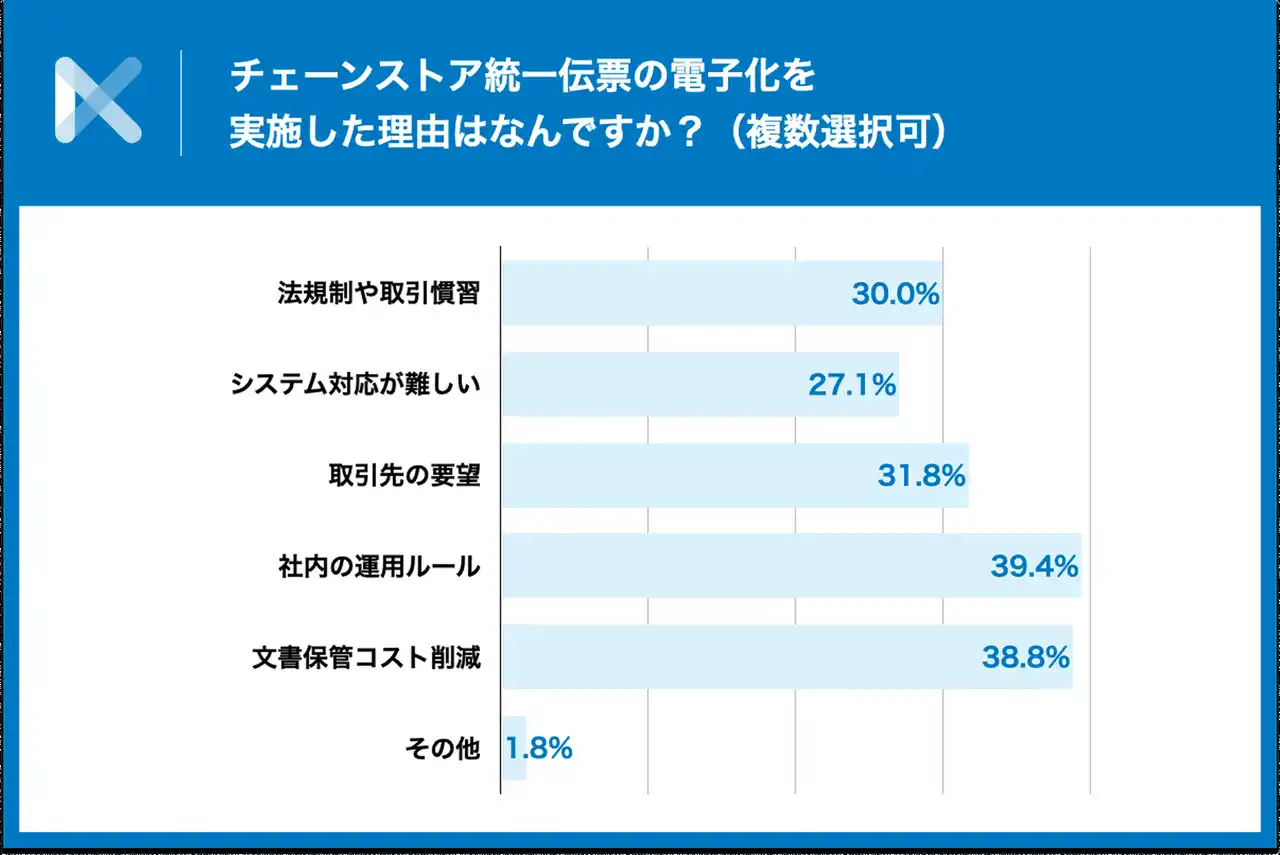 「チェーンストア統一伝票の電子化を実施した理由はなんですか?」と質問したところ、最も多かったのは「社内の運用ルール」で39.4%、次いで「文書保管コスト削減」が38.8%となり、社内業務の効率化やコスト意識の高まりが推進要因となっていることが分かりました。また、「取引先の要望」も31.8%と高く、取引先との業務円滑化や対応力強化も電子化を後押ししていることがうかがえます。一方、「法規制や取引慣習」は30.0%、「システム対応が難しい」は27.1%にとどまり、法的義務よりも実務上の利便性や取引関係の要請が、電子化の主要な動機であることが示されました。 |