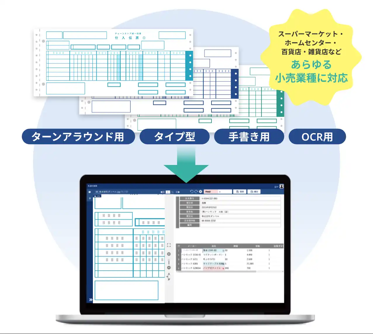 OCRを活用することで、手入力によるミスの削減やデータ化作業の自動化が進み、紙伝票を前提とした業務であっても処理精度と業務効率の向上が期待できます。EDIやWeb入力と組み合わせることで、段階的にDXを推進できる点も大きなメリットです。 |
