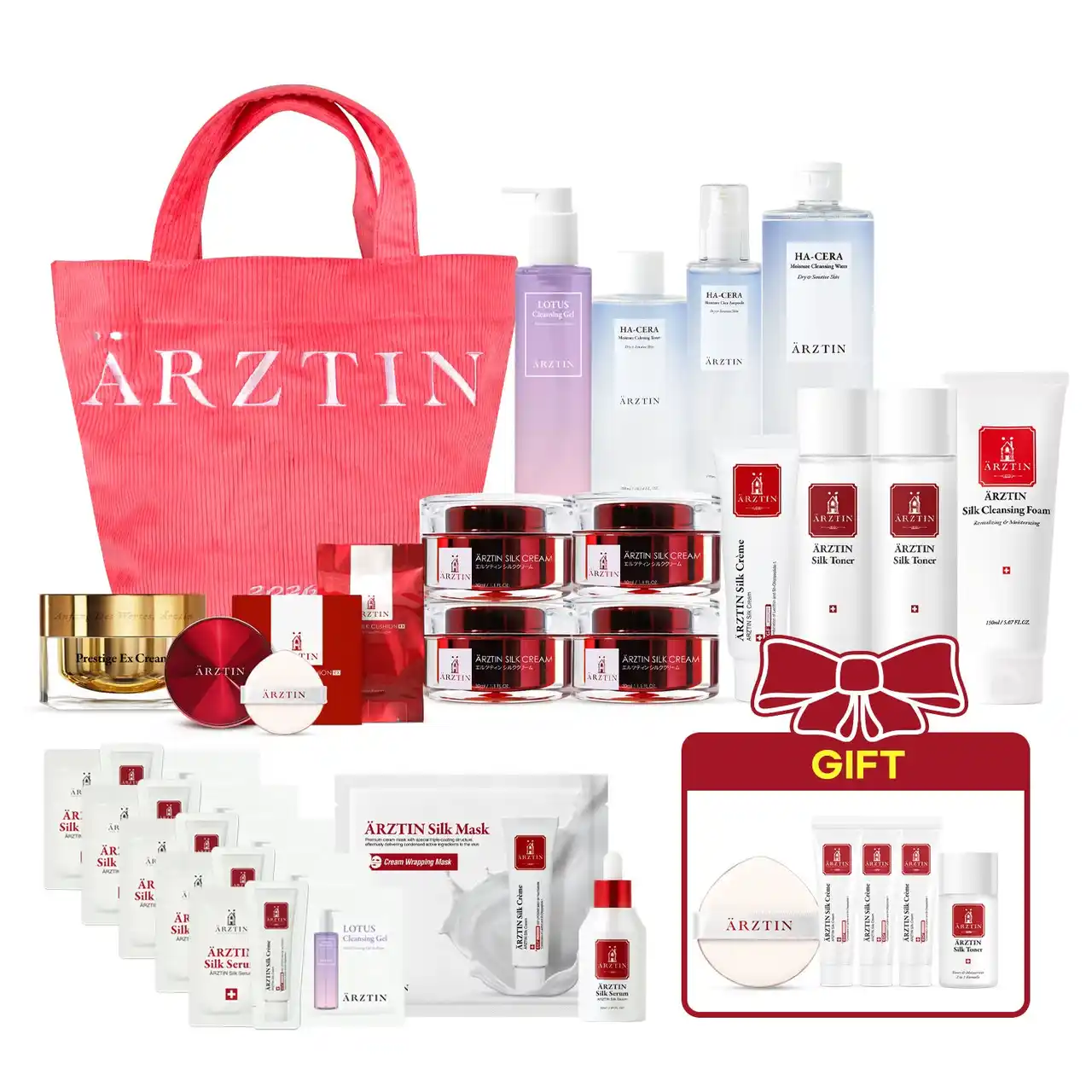 洗顔料、化粧水、美容液、クリーム、クッションと基礎スキンケアが揃えられる充実した中身の現品合計最大17点であり、さらにシルクライン以外にもエルツティンのヴィーガンラインヒアセラクレンジングウォーター、ヒアセラモイスチャートナー、ヒアセラモイスチャーシカセラムと日本限定ロータスクレンジングジェルとシルククッションRXもあり、福袋には珍しいエルツテインの高級ラインプレステージEXクリームもあっていつもよりもかなり豪華である。そうして、プレゼントサンプルも十分な容量と定価93,827円相当の内容で約73%OFFで25,000円となる。 25,000円福袋セットには 新しいデザインの可愛いビックロゴ入りでピンク色のコーデュロイ生地でしっかりしたバックなので使用で豪華な内容となってる。 |