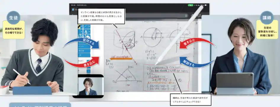 | ノートや教材への書き込みがリアルタイムで共有される授業システムを導入し、講師と生徒が同じ画面で確認しながら授業を進めます。学習時に起こりがちな「分かったつもり」を防ぎ、理解度や学習過程をしっかり把握しながら進行するため、効率的かつ深い学びを実現します。 | |||