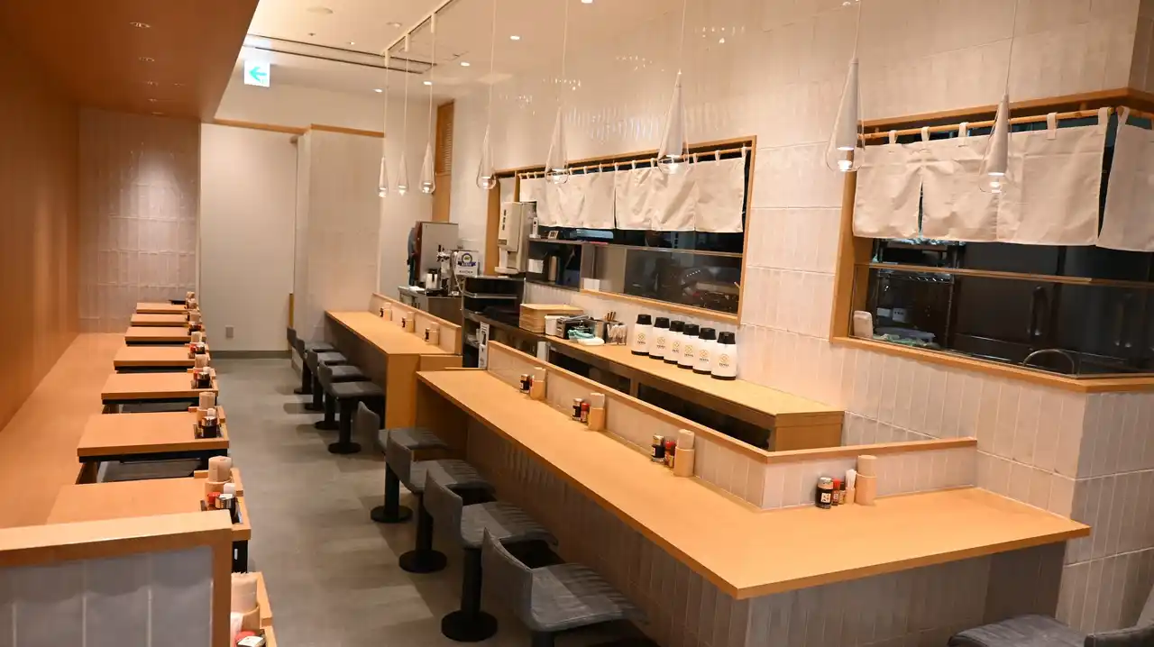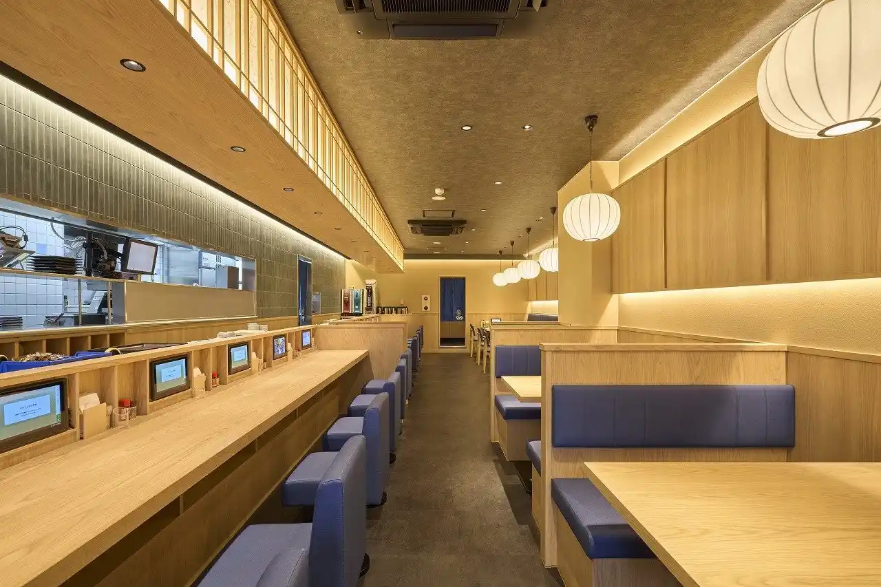 店舗デザインにおいては、シンプルに和を表現したモダンなデザインでお食事への新たな期待感を演出します。入口からの店内の視認性を向上、お食事の時間の快適さと心地良さを上げるためテーブルサイズ・カウンター席の間隔の見直し、ファミリーなどグループにも対応できるベンチシートやBOX席などを設置。さらに和を意識した素材の照明やテーブルの自然な木目の温かみで、落ち着きと親しみを感じていただけるデザインとしました。 |