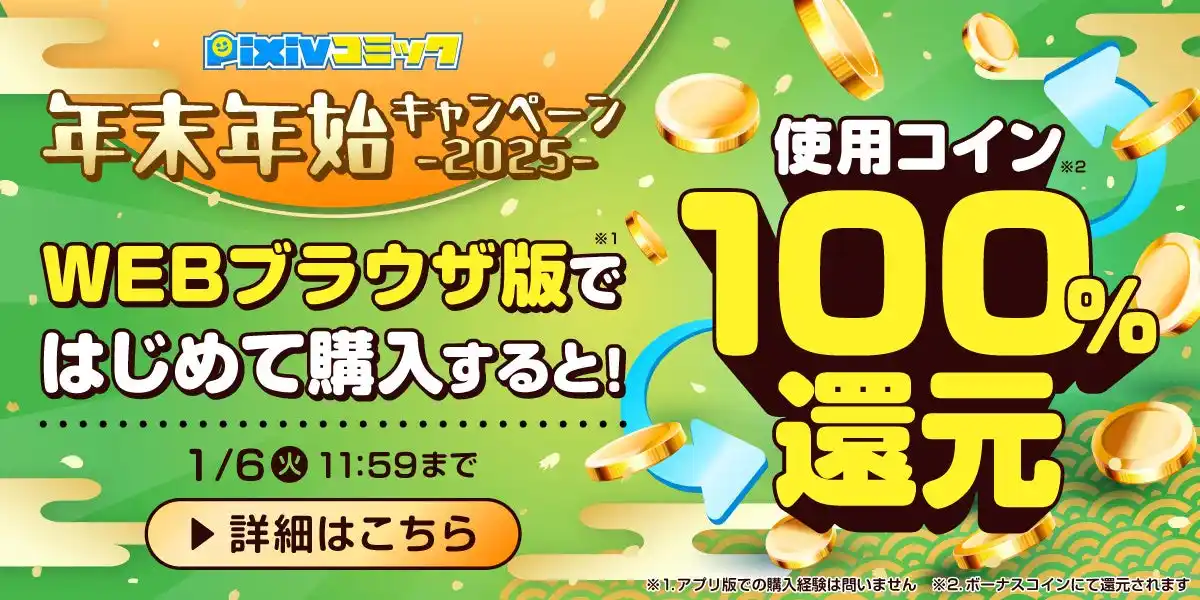 | 期間中、ブラウザ版pixivコミックにてはじめて単行本をご購入された方全員に、ご購入金額と同額のボーナスコインを後日還元いたします。 | |||||||