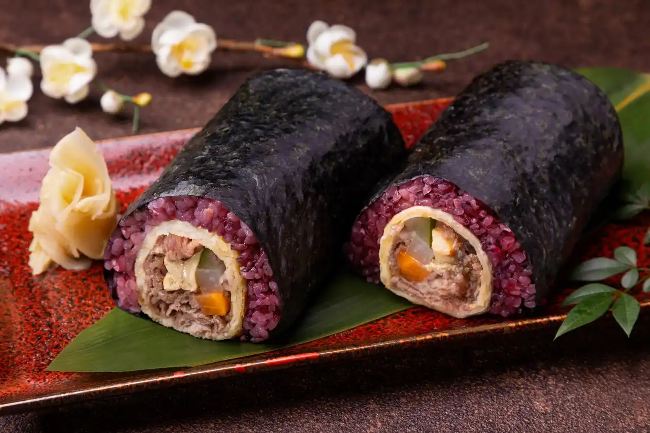 甘辛く煮込んだ国産牛ロースと濃厚なフォアグラを合わせた贅沢な恵方巻です。縁起を担ぐ黒米の香ばしさが、牛肉の旨味とフォアグラの濃厚さを引き立て、奥行きのある味わいに仕上げています。 |