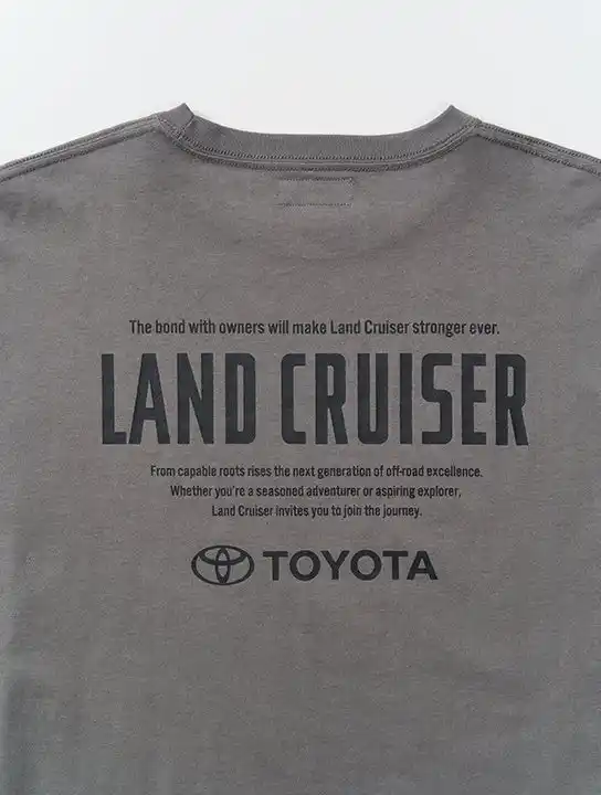 デザインは、ランドクルーザーのロゴを同色刺繍でさりげなく配置し、DuPont社の「Tyvek」で仕立てたミルスペック調タグをアクセントにしました。 |