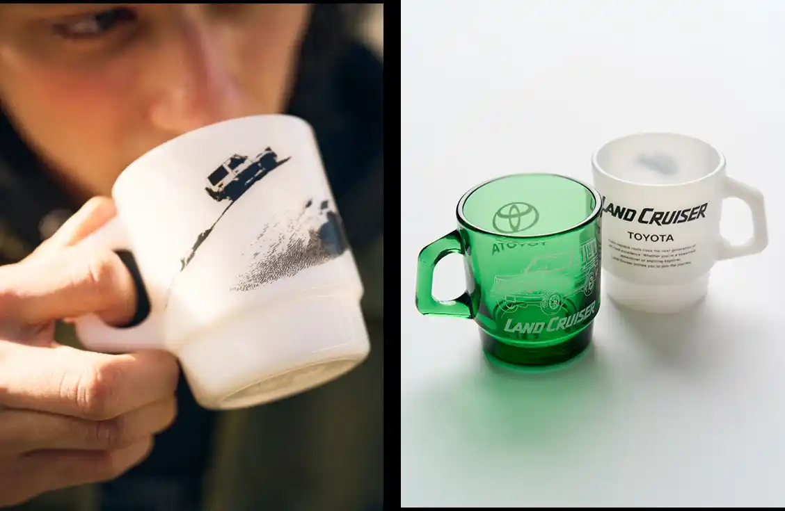 カラーにはFire-Kingを代表する「ミルクホワイト」を採用。形状はスタッキング可能な「スタッキングマグ」をベースに、砂丘(DUNE)を駆け上がるランドクルーザーのイラストをあしらった数量限定デザインです。 |