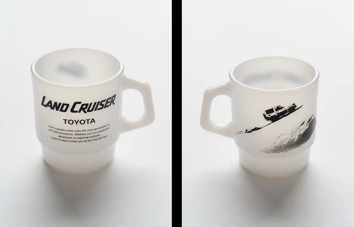 <Fire-King名作マグカップとのコラボレーション。日本製ミルクガラスならではの高い耐久性と重厚感のある質感が魅力。砂丘を駆け抜けるランドクルーザーをデザイン> |