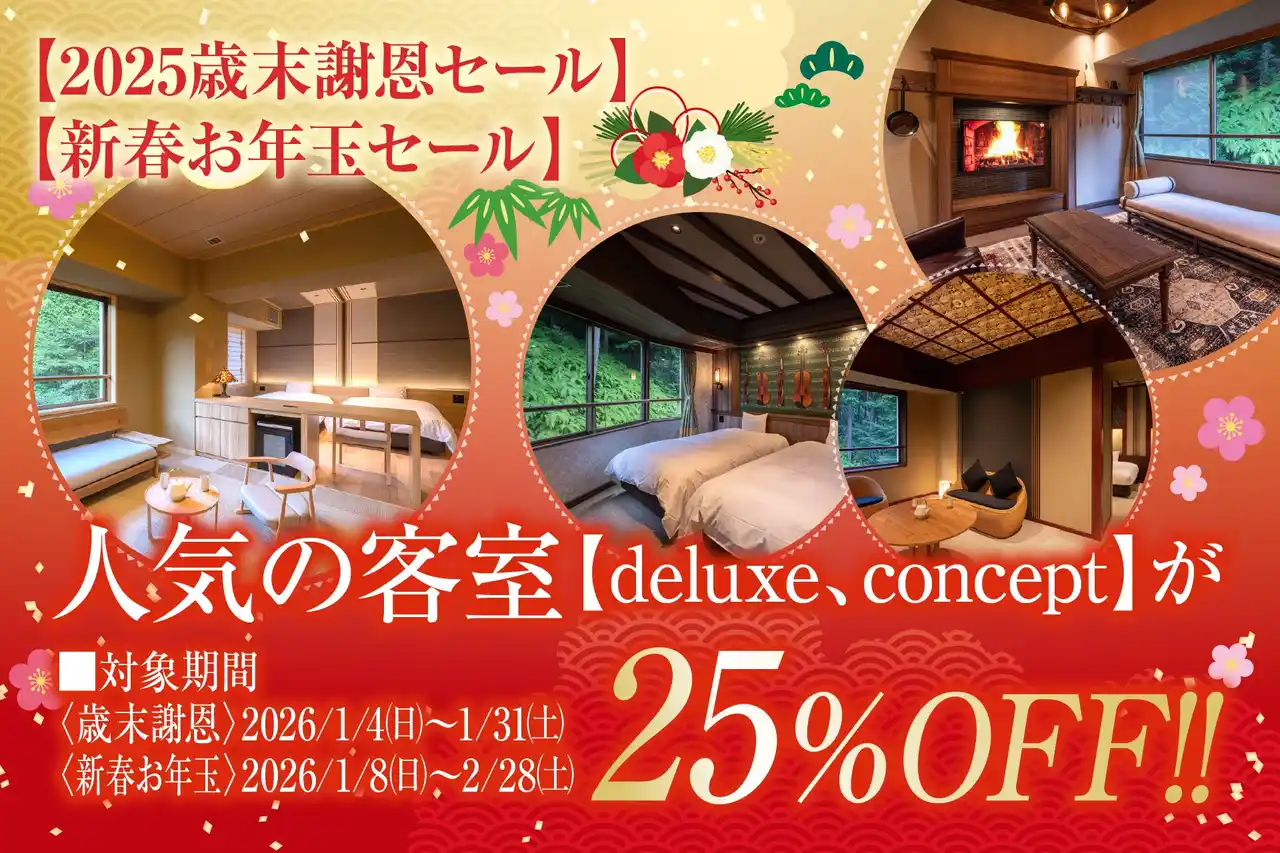 | 感謝の気持ちを込めて【新設客室開設記念プラン】と【歳末謝恩&新春お年玉セール】で最大25%OFF! 温泉水をふんだんに使った冬の会席料理もスタート! |