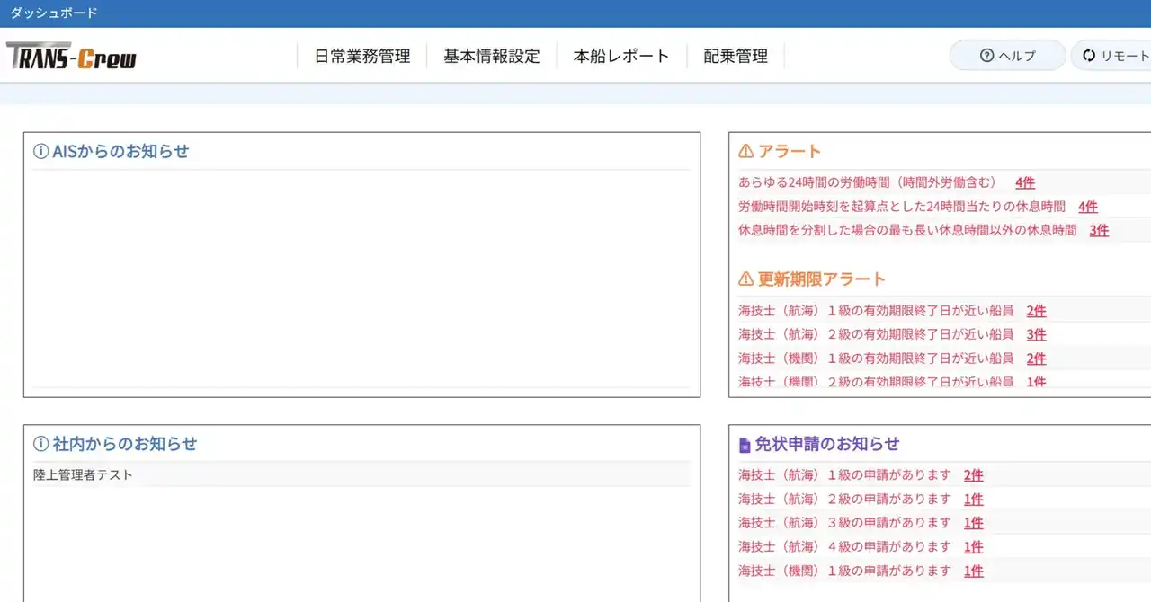 株式会社エイ・アイ・エス(本社:東京都千代田区、代表取締役社長:大浦 博、以下「AIS」)は、船員向け労務管理システム『TRANS-Crew』において、日本郵船株式会社(本社:東京都千代田区、代表取締役社長:曽我 貴也、以下「日本郵船」)と協業し、船員の資格および有効期限を一元的に管理する「資格・有効期限管理クラウドサービス」(以下「本サービス」)の開発を完了し、正式に提供を開始しました。 |