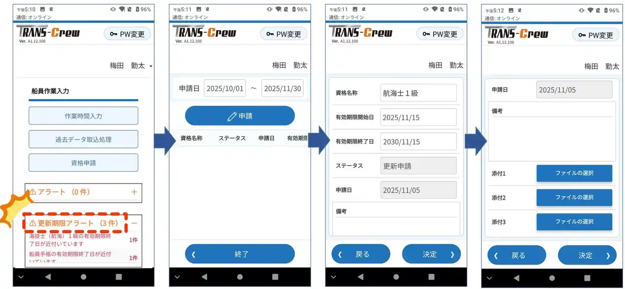 更新期限が近づくと、船員本人と担当者へ自動通知。更新漏れを防止。 |