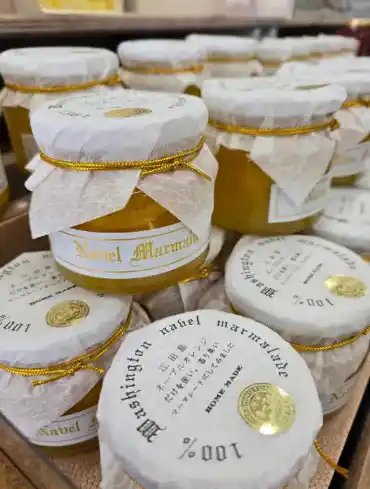 お土産に人気のネーブルマーマレードやジャムなどの加工品、手土産のお菓子類も!人気急上昇中のマスコットキャラクター・えたぼうの「えたぼうクッキー」も食べてみんちゃい♪ |