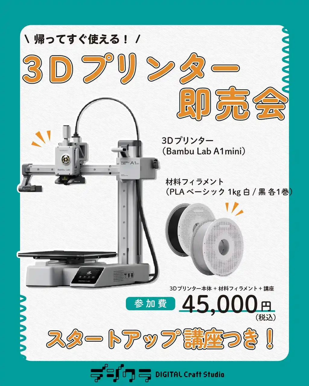 買って・学んで・すぐ使える 実践重視のスタートアップ講座の参加費内には 「Bambu Lab A1 mini」本体+フィラメント2色 を含み、箱開封~組立~初期設定~基本操作~無料ソフトでの初歩データ作成まで、初心者がつまずきやすい部分を丁寧にレクチャーします。 |