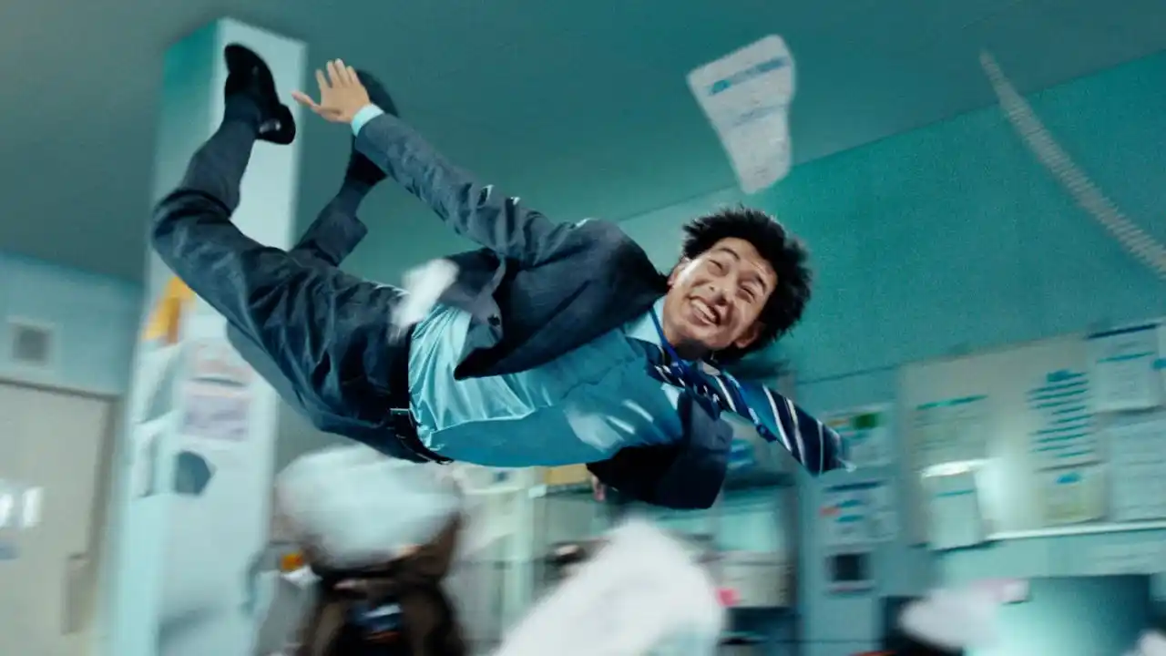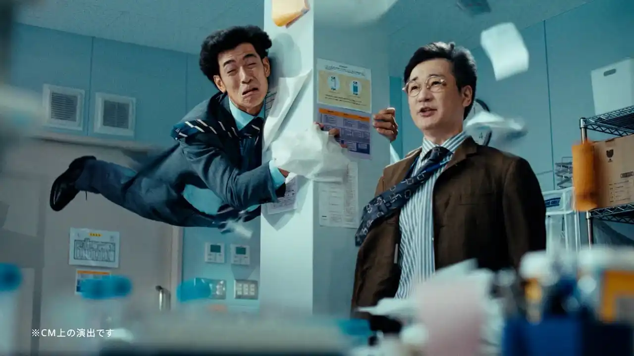 主役は、前作同様に俳優の中島歩さんです。吹き荒れる“逆風”の中で真剣に研究と向き合う社員たちの一方、安井順平さん演じる上司とともに研究所に入った中島さんは、あわや飛ばされそうになってしまいます。しかし研究員がブレイクスルーした瞬間、“逆風”は“追い風”に変わり、中島さんも希望に満ちた表情で風に乗っていきます。 |