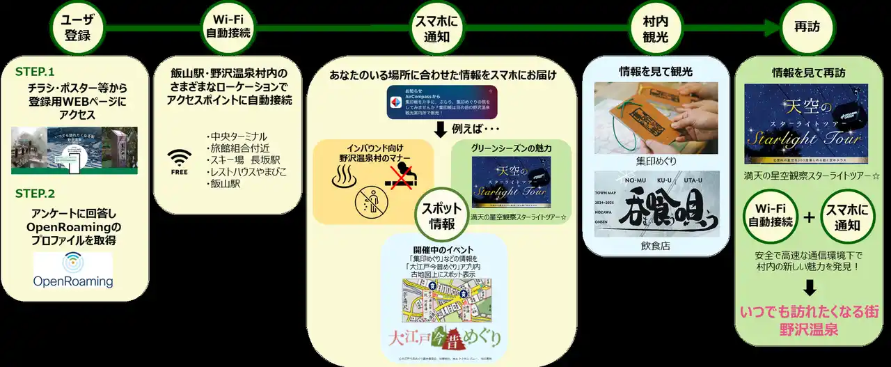 本実証では、野沢温泉村に来訪された方がOpenRoamingを利用してWi-Fiに接続したタイミングで、開催中のイベントや季節のおすすめ情報、観光スポットなどをプッシュ通知でご案内します。 |