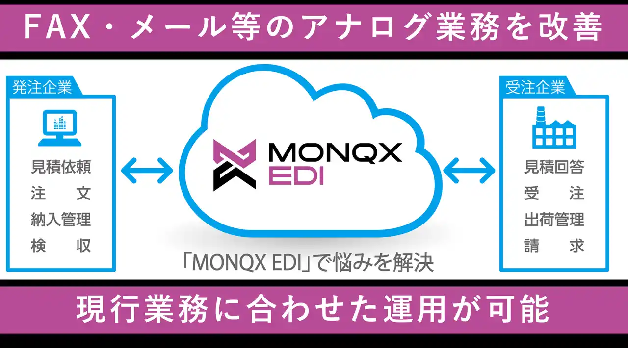 当社はデジタルで「日本のものづくり企業の自己変革を強力にサポートする」という決意を込めたものです。 「MONQX」は6つのサービスで構成されており、今回はその中から「MONQX EDI」をご紹介します。 |