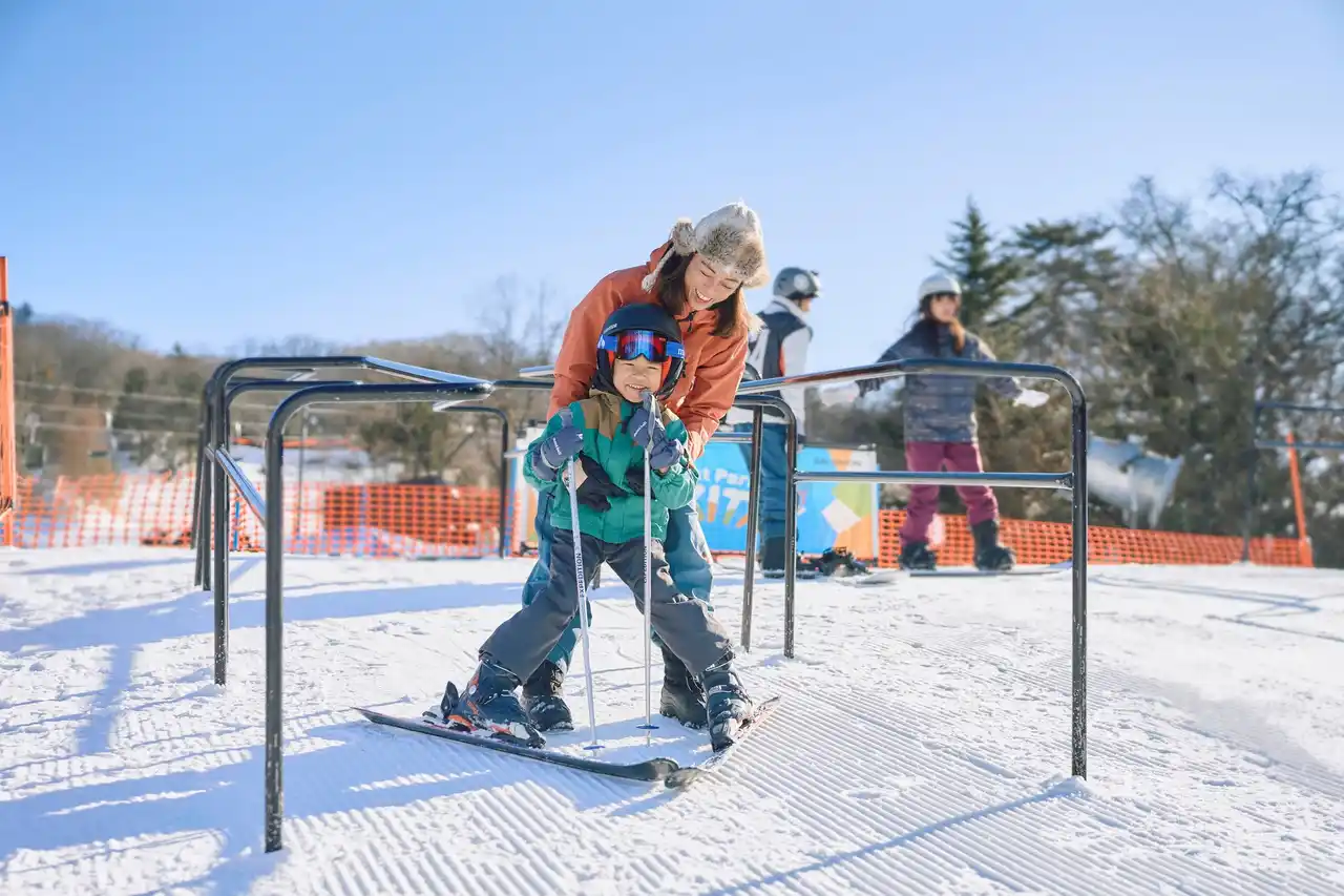 昨シーズン、日帰りエリア、ウエストエリアに新設した小学生以上の未経験者が対象の「デビューパーク」を、今シーズンはイーストエリアにも増設します。「デビューパーク」ではリフトの乗り方から滑り方までを幅広くサポートし、初めての方でもハンドレールを活用することで安全にスキー・スノーボードを覚えることができます。 |