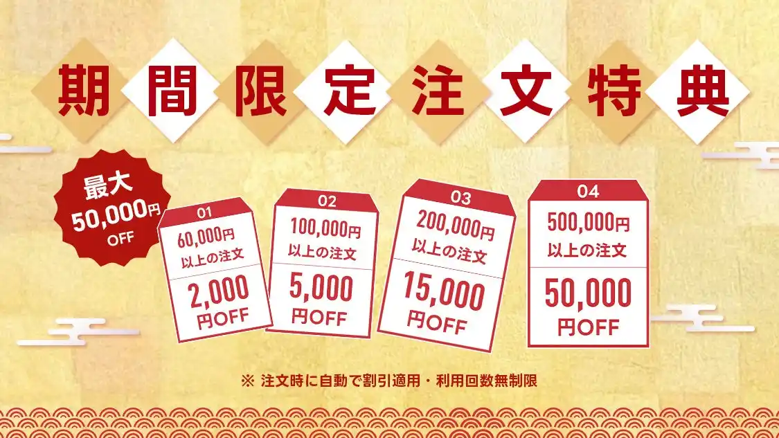 ・6万円以上のご注文 → 2,000円OFF ・10万円以上のご注文 → 5,000円OFF ・20万円以上のご注文 → 15,000円OFF ・50万円以上のご注文 → 50,000円OFF |