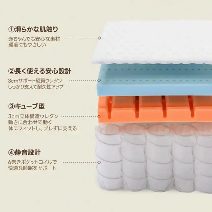 日本人の体格や寝姿勢に合わせて設計された、最適なマットレス。穴あきメモリーフォームを採用し、優れた通気性でムレにくく、一晩中快適。3D立体構造ウレタンと独立スプリングが体をしっかり支えつつ、体圧を均等に分散し、快適な睡眠環境をお届け。 |