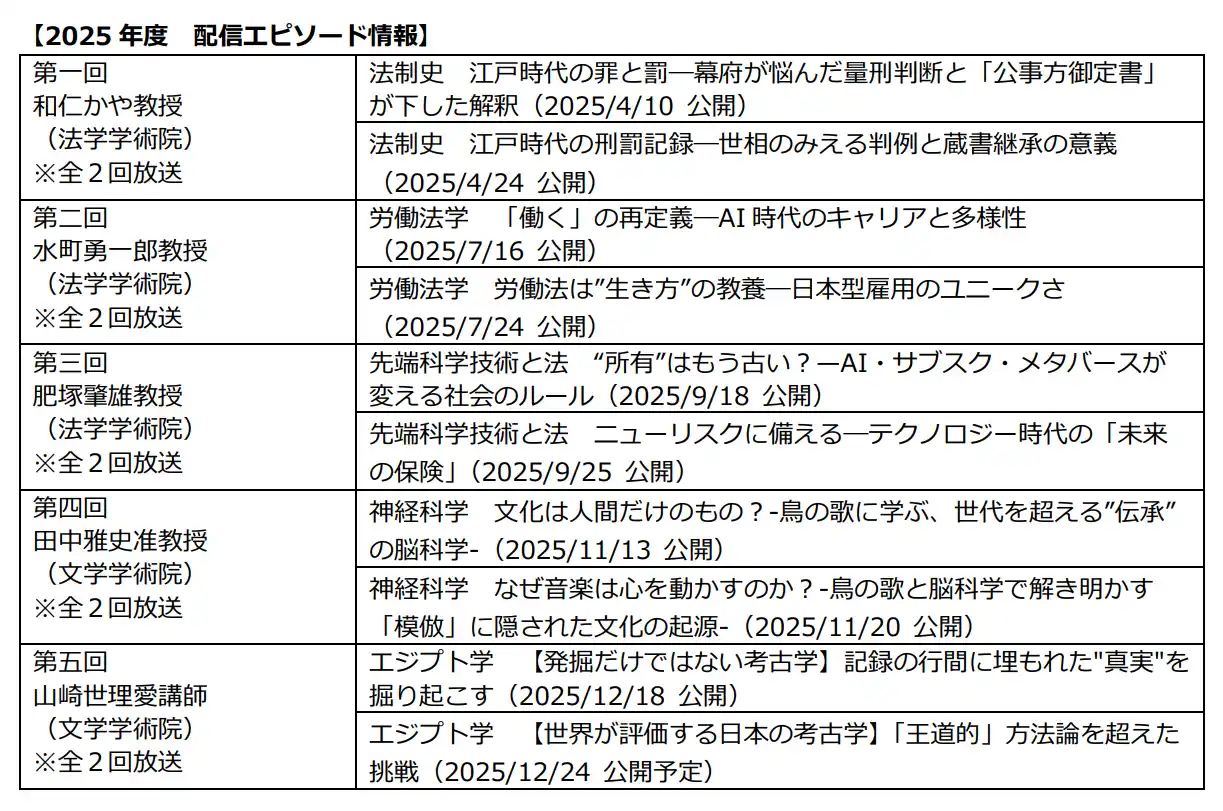実践主義を徹底したアンガーマネジメント研究/本田恵子教授』『応用言語学:文理融合で社会実装 言語教育のAI活用を支える言語テスト妥当性研究の真髄/澤木泰代教授』『社会学:世の中の前提を紐解く、社会学的感覚/若林幹夫教授』『紫式部の生きた軌跡・宮廷女房たちが映し出す平安社会の姿/福家俊幸教授』も番組HPより視聴いただけます。 |