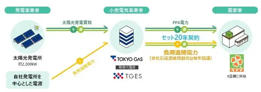| 株式会社ライフコーポレーション(社長:岩崎 高治、以下「ライフコーポレーション」)、東京ガス株式会社(社長:笹山 晋一、以下「東京ガス」)、および東京ガスエンジニアリングソリューションズ株式会社(社長:小西 康弘、以下「TGES」)の3社は、ライフコーポレーションの首都圏9店舗へオフサイトコーポレートPPA[*1]スキーム(以下「本スキーム」)による再エネ電力の供給を実施することに合意しました。 | |||||||||