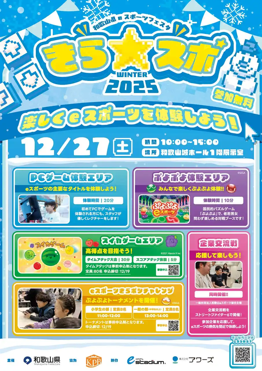 (6)応募方法 e スタジアム公式 HP 内応募フォームよりお申込みください ※2026 年 1 月 16 日<金>締切 https://e-stadium.jp/2025/12/12/wakayama_esports_2026/ (7)お問い合わせ先 e スタジアム株式会社 イベント総合お問い合わせフォーム https://docs.google.com/forms/d/e/1FAIpQLSe8hFDiH80U9Dyx1cfeOZMD1VfEC3e_NiDMaAvLp2AxocKTOg/viewform |