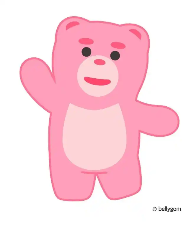 ベリゴムは韓国うまれのピンクのクマ! BELLY は英語で「おなか」、GOM は韓国語で「クマ」 。 |