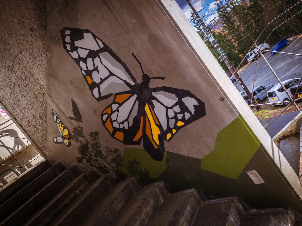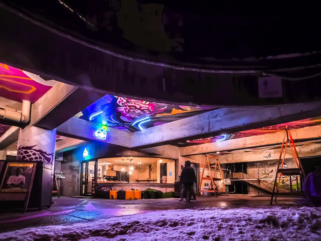 エスカルプラザ南側のゲレンデ向きに、Lift Up Coffeeというオーストラリア・メルボルン発のカフェ(冬季のみ営業)がございます。その店舗前のコンクリート空間は人が集う場所になっていますが、奥行きがあるため薄暗く殺風景で、ここで何か「遊び心」のある面白いことができないかと数年前から模索しておりました。 |