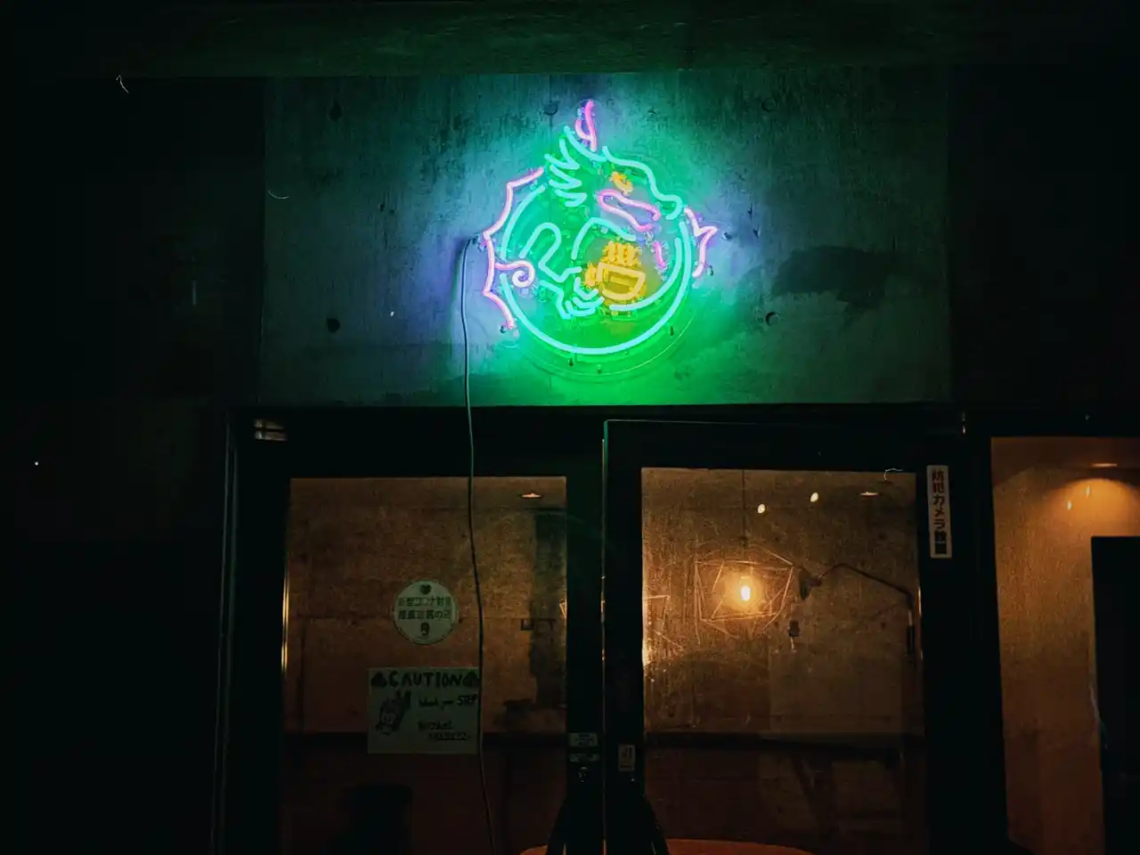 はらわたちゅんこ氏のネオンアートは、コーヒーカップに乗った白馬五竜の山の風景や、淹れたてのコーヒーカップを手にした「竜」をモチーフにしたデザインになっています。ネオンを夜もライトアップすることで、ナイター営業も華やかに彩ります。 |