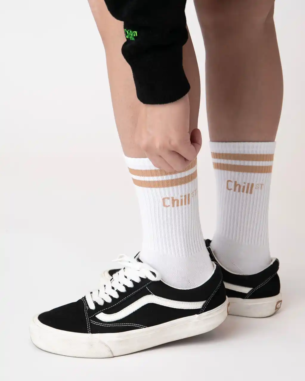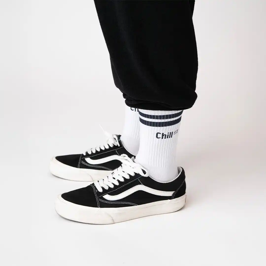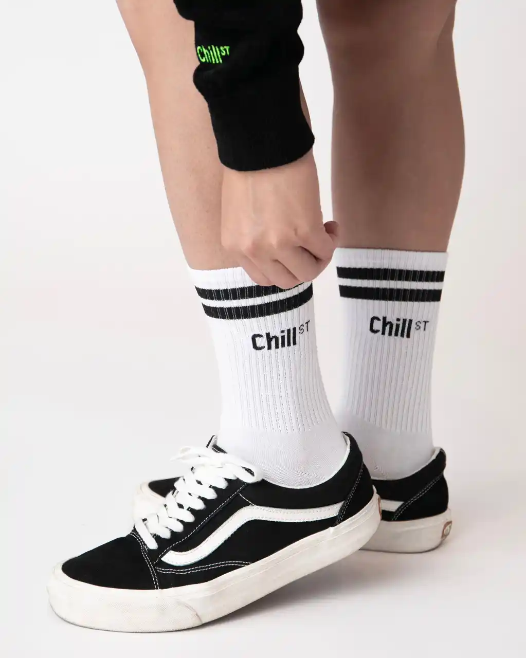 今回、Chill STご愛用者から “ストリートパジャマに合う小物が欲しい” という声が多数寄せられたことを受け、初のオリジナルソックスを製作いたしました。Line Socksは、クリーンなホワイトをベースに、ストリートのムードを感じさせる2本のラインをアクセントにデザインしました。ふっくらとした程よい厚みと、締めつけすぎない絶妙なフィット感で、一日中快適な履き心地を実現しています。足元の蒸れやズレを軽減しながら、スニーカーとの相性も抜群です。普段着に自然に馴染みながらも、さりげないアクセントでスタイリングをアップデートしてくれる、“街でも部屋でも使える”ラインソックスです。 |