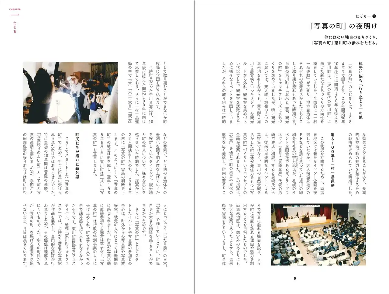 | 北海道の中央に位置する小さな町、東川町が「写真の町」を宣言してから40年という節目に制作した冊子です。人口8,700人ながら、30年間人口が少しずつ増え続け、現在は「地方創生の成功例」としても注目される東川町ですが、その根幹にはこの「写真の町」が重要な役割を担ってきました。冊子では、「そもそも何故写真の町なのか?」「町にとってどういう意味・価値があるのか」などを、「写真」そのものに興味がない方や町民でも読みやすい形で届ける工夫をしながら、文化での町づくりがどういう意味や価値を持つのかを見つめ直した1冊です。東川町の「文化での町づくり」の実践には、歴史の積み重ね方や町民と行政の関係性の中に、他の自治体にも活かせる多くのヒントがあるはずだと信じています。 | |||||||||||