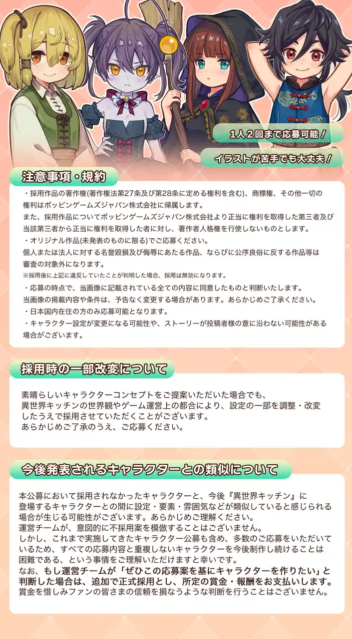 | 素晴らしいキャラクターコンセプトをご提案いただいた場合でも、異世界キッチンの世界観やゲーム運営上の都合により、 設定の一部を調整・改変したうえで採用させていただくことがございます。 | |||