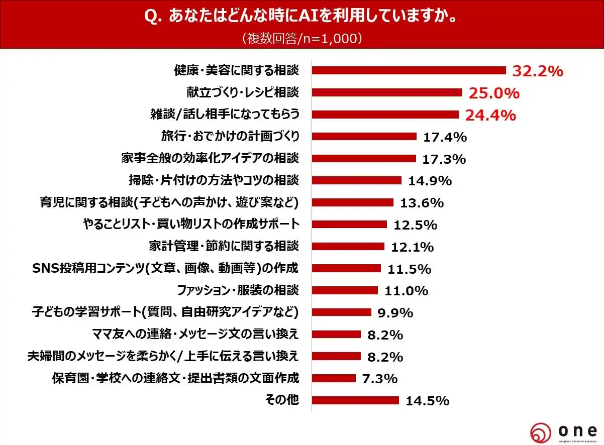 | マーケティング支援事業を手掛ける株式会社one(本社:東京都新宿区、代表取締役CEO:清水佑介)は、2025年12月3日(水)~12月5日(金)の3日間で、全国の18歳以上の既婚女性1,000人を対象に「主婦のAI活用に関する調査」を実施しましたので発表いたします。 | |||||||||||||||