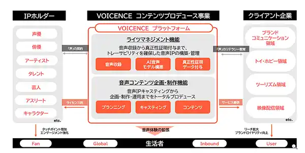 音声AI事業 「VOICENCE」は、AI音声合成と独自の権利保護技術を組み合わせたプラットフォームを構築することにより、声優・俳優・タレントなどの実演家から提供された「声」を「公認AI」として、安全かつ健全な活用を促進するコンテンツプロデュース事業です。 |