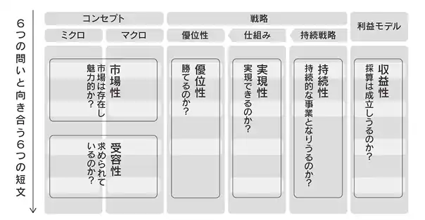 専門性の異なるメンバーや、決裁権を持つ経営層との間では、事業を評価する観点や、ビジネスモデルに対する認識のズレが障壁となりがちです。VDSは、事業見極めに必要な論点を6つに定めた上で、ビジネスの全体像を誰もが理解できる「構文」で可視化するため、認識の齟齬を防ぎます。 |